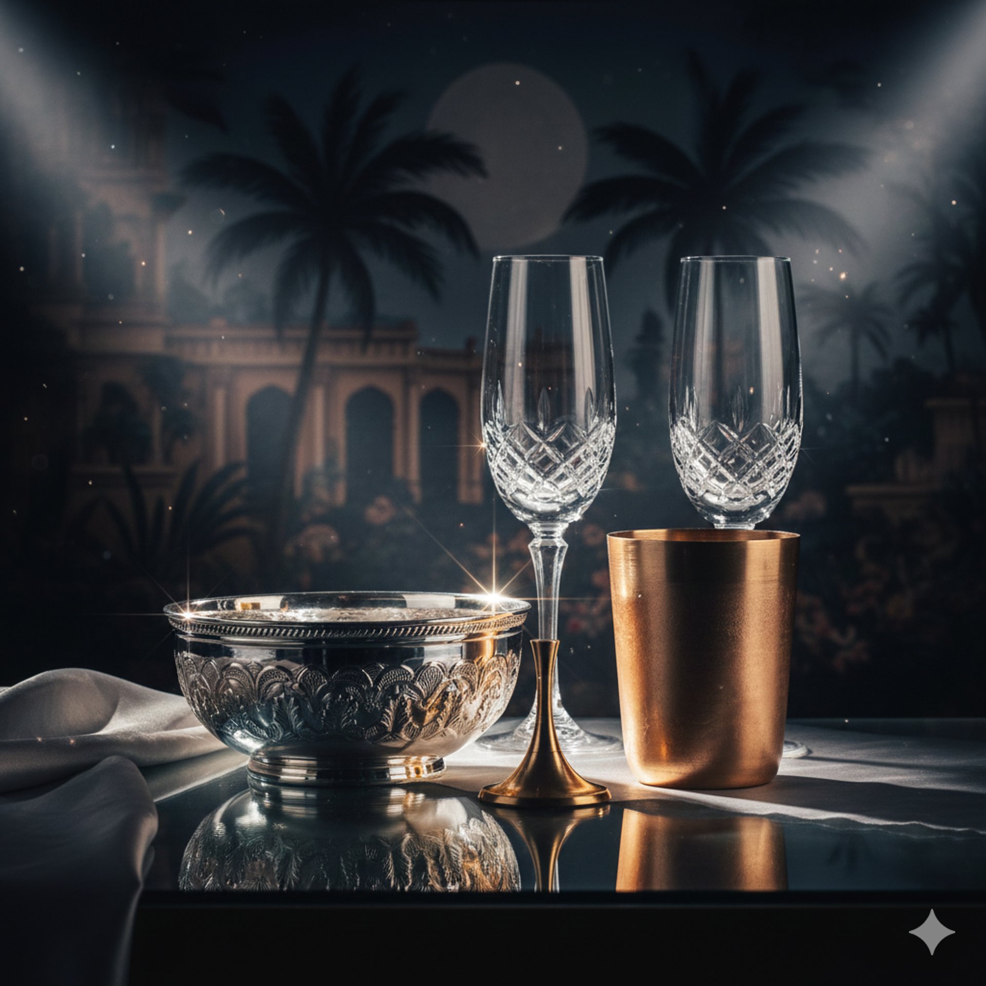 Minimal glassware feels international and relaxed — exactly the Goa vibe.